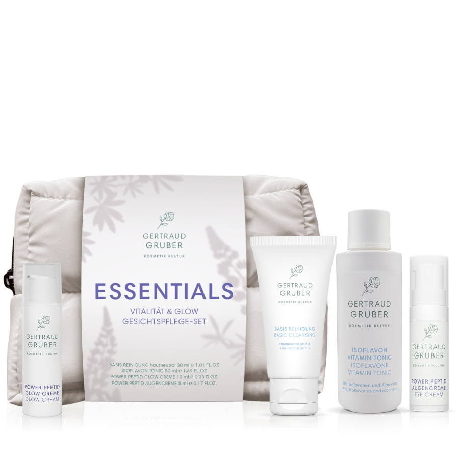 Das Gertraud Gruber ESSENTIALS VITALITÄT & GLOW - GESICHTSPFLEGE-SET kombiniert vier wirkungsvolle Pflegeprodukte in einer stilvollen Kosmetiktasche – ideal zum Kennenlernen oder als kompakte Pflegeroutine für unterwegs und auf Reisen. Die hautneutrale BASIS REINIGUNG reinigt die Haut und bereitet die Haut optimal auf die anschließende Pflege vor. Das ISOFLAVON VITAMIN TONIC erfrischt mit vitalisierenden Wirkstoffen, während die POWER PEPTID GLOW CREME die Haut intensiv vitalisiert und ihr einen natürlichen Glow verleiht. Die POWER PEPTID AUGENCREME sorgt für eine glatter wirkende, frischere Augenpartie.