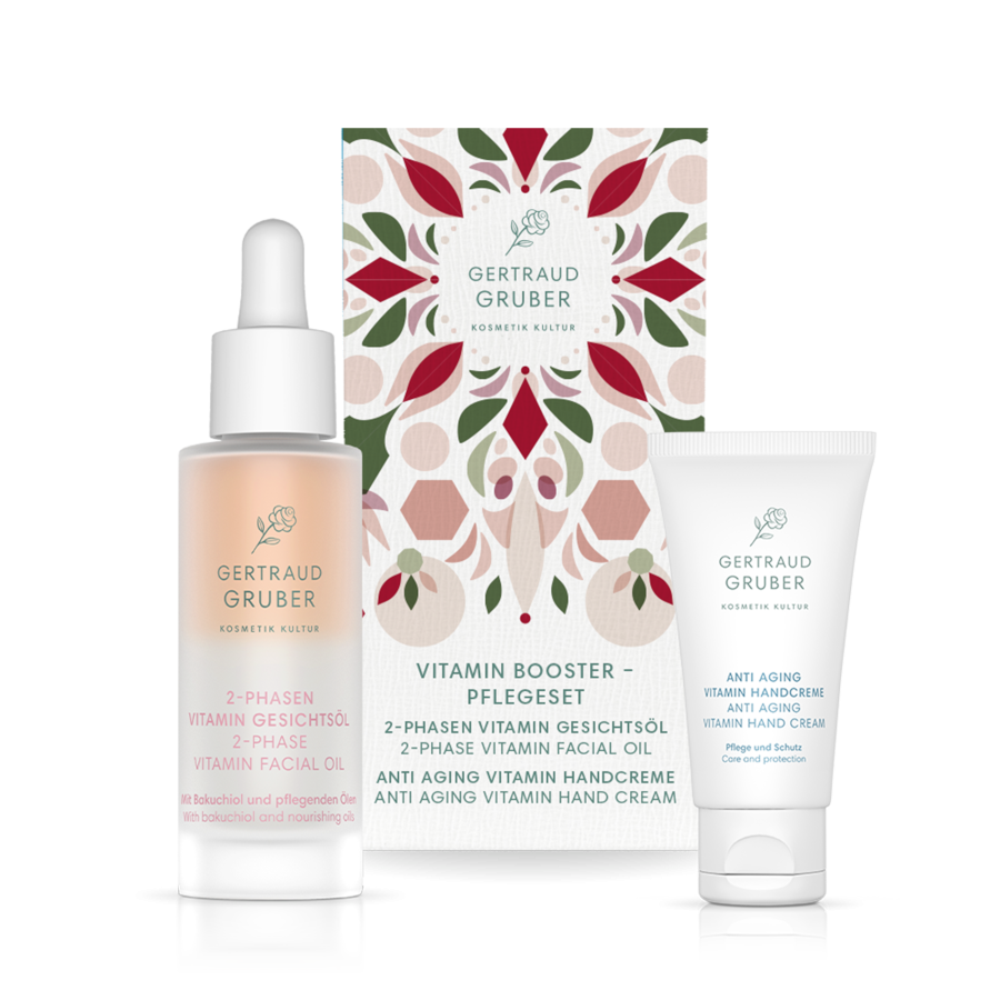 Gertraud Gruber 2-Phasen Vitamin Gesichtsöl, 30 ml verwöhnt und pflegt die Haut intensiv. Der Vitamin-Booster mit Vitamin E, C und B3 schützt vor Freien Radikalen. Bakuchiol stimuliert die Collagenbildung und verbessert die Hautelastizität und -festigkeit. Hochwertige Öle wie Jojoba-, Argan-, Pfirsichkern-, Sanddorn- und Teesamenöl sorgen für intensive Pflege und ein geschmeidiges Hautgefühl. Die wohltuende 2-Phasen-Produktinnovation ist emulgatorenfrei und verführt die Sinne mit seinem frischen Duft.